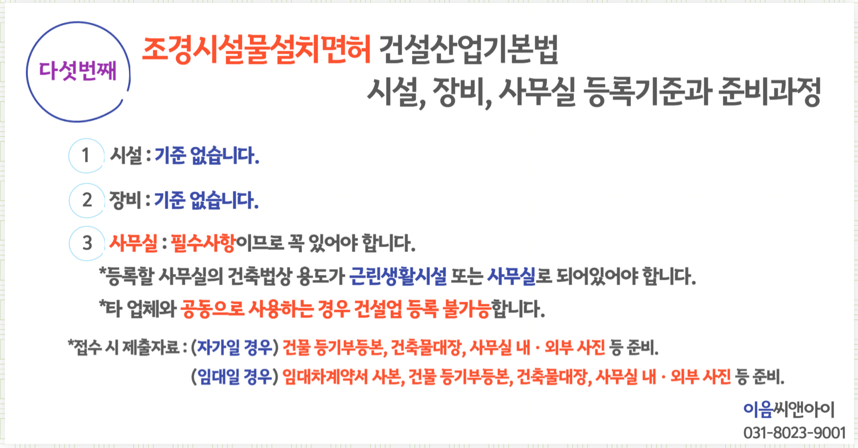 5. 조경시설물설치공사업 : 건설산업기본법 시설, 장비, 사무실 등록기준과 준비과정. (확인사항 : 건축법 상 용도가 적합한 사무실)
